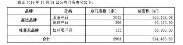 目前,旗下拥有“惠达”、“杜菲尼”两大自有核心品牌,截止2019年12月31日,共拥有门店2963家,其中惠达卫浴2012家,惠达瓷砖396家,杜菲尼产品555家。其中,“惠达”品牌新建门店348家,升级改造171家;“杜菲尼”品牌新建门店129家,升级改造9家。