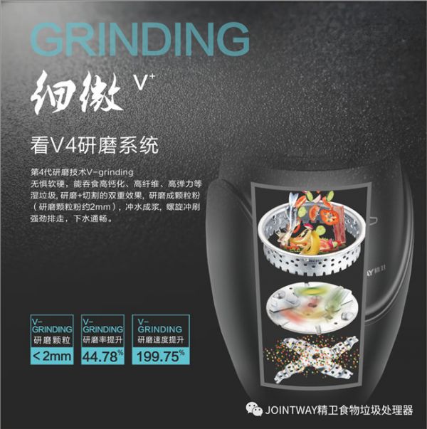 第4代研磨技术V-grinding,无惧软硬,能吞食高钙化、高纤维、高弹力等湿垃圾,研磨+切割的双重效果,研磨成颗粒粉(研磨颗粒粉约2mm),冲水成浆,螺旋冲刷强劲排走,下水通畅。