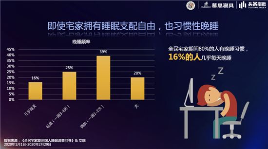 白皮书还对人们的晚睡频率进行了分析,结果显示,80%的人有晚睡习惯,16%的人几乎天天晚睡。