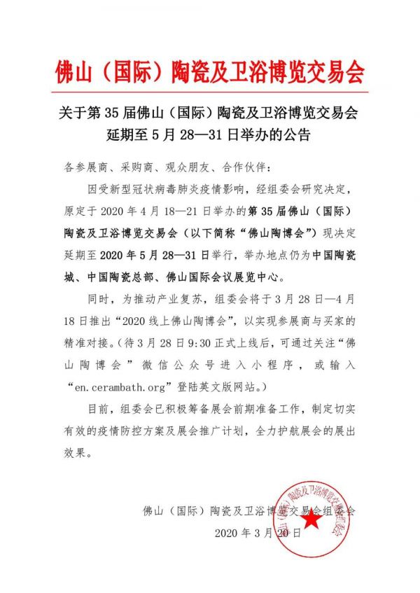 快讯 | 第35届佛山陶博会延期至5月28—31日举办