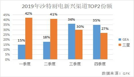 据悉,沙特家电市场分两块,分别是连锁渠道和新兴渠道。从连锁渠道的数据来看,TOP3分别是GE Appliances、LG、MABE。从新兴渠道的统计数据来看,GE Appliances和三星占据主要市场,从数据走势看,GE Appliances在新兴渠道的占比也是持续增长,从第一季度的15%到第四季度的35%。