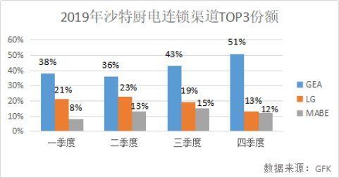据GFK统计数据显示,2019年沙特厨电市场份额TOP3分别是GE Appliances、LG、MABE。在沙特厨电市场占据80%的连锁渠道,作为“海尔系”厨电重要组成部分,GE Appliances 2019年4个季度市场份额分别是38%、36%、43%、51% ,份额持续走高。