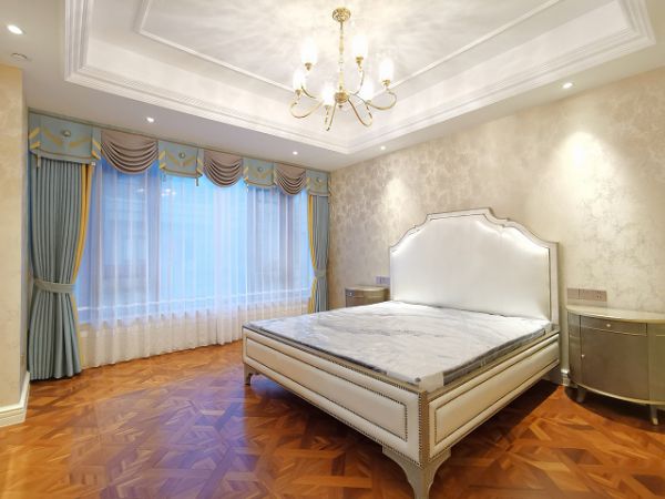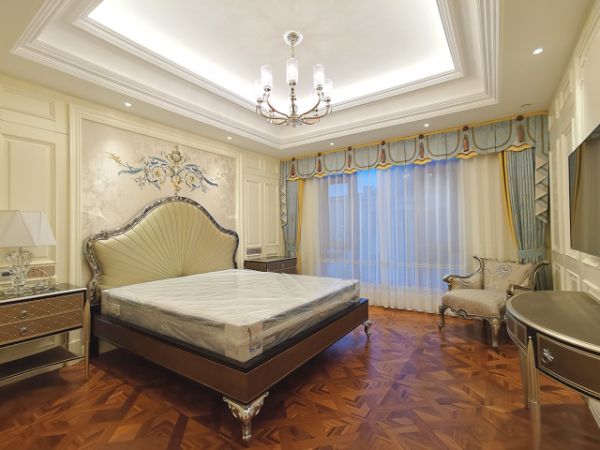 与全屋的欧式底部相搭配的是乾庄的欧式刺绣背景,主人的主卧选用的是背景《希泰》,手绣级别的刺绣工艺,乾庄用匠心打造您的家。