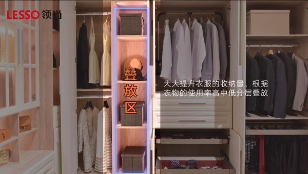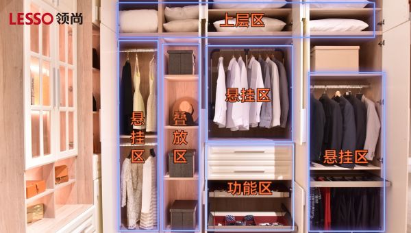 领尚衣柜根据衣物的长短、使用的频率以及人体工程学分为不同的区域进行精细化设计,有长衣悬挂区,短衣悬挂区、裤挂区、叠放区,达到分类整理的效果。
