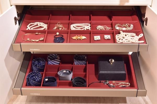 为了方便配饰等小物件的收纳整理,领尚衣柜利用抽屉、格子架打造多个个性功能区间。抽屉用于放置一些私人物品,比较安全可靠;格子架用于放置领带、首饰等小件物品,将它们区分开来各据一隅,井井有条又十分好看。