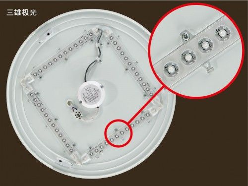 三雄极光吸顶灯采用一体化光源模组,整体元器件分布规范合理,将线路、元器件与外界隔绝,防止徒手触碰,更稳定,更安全。