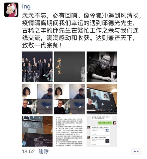 邱德光:这次疫情让大家关注湖北、武汉,也让创基金关注到了湖北设计师这个群里。创基金作为一个设计师发起的基金会,除了捐赠物资,还希望用我们专业的力量,为你们做一些实实在在的事情。采用这样面对面交流的方式,因为我们觉得,一对一的关怀更加珍贵、更有温度,对每位设计师而言也是独一无二的。