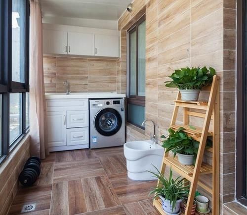 可以在阳台设计一个洗衣台,洗衣台可以用来存放洗衣机,这样对日常洗衣服和晾晒也非常方便,当然在墙面空间中再设计些吊柜用来储物也是可以的。