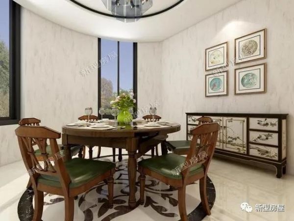 农村逢年过节亲友都在家吃饭,餐厅配上一个10-12人用餐的圆桌最为实用,直径1.8m,两边相对的椅子宽度1米,两边椅子伸缩宽度和活动空间1.2m。