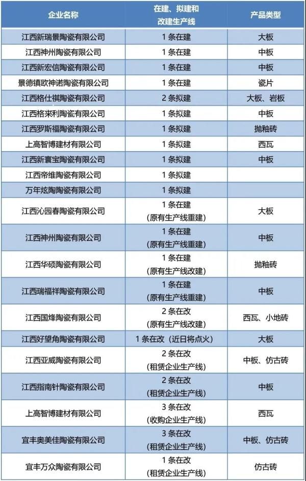 2020上半年江西陶瓷企业在建、拟建和改建生产线情况
