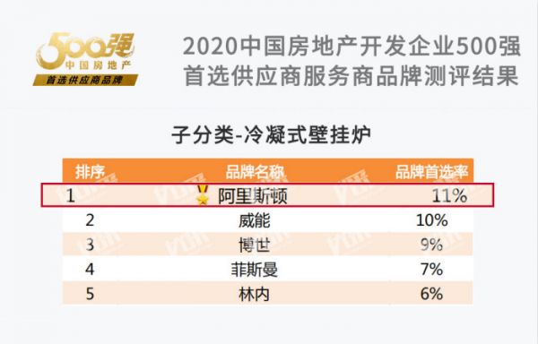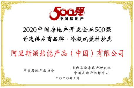 阿里斯顿荣膺2020中国房产500强首选冷凝壁挂炉品牌桂冠