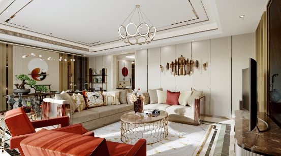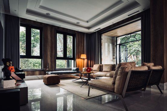 客厅运用了大面积的原木色家具,从地毯到沙发,都是不过分修饰、不过分渲染的天然本色,让整个空间显得静谧温柔。但朱红色的摆台、清透的红花瓶,却又悄然之间注入无无限的生机和活力。暖橘色的新中式立式台灯位于客厅一隅,既装点得整个房间充满温情,又不喧宾夺主,巧妙无比。三面落地窗外的绿色生机盎然,投射到客厅里来,整个房间仿佛都置于鸟语花香之中。