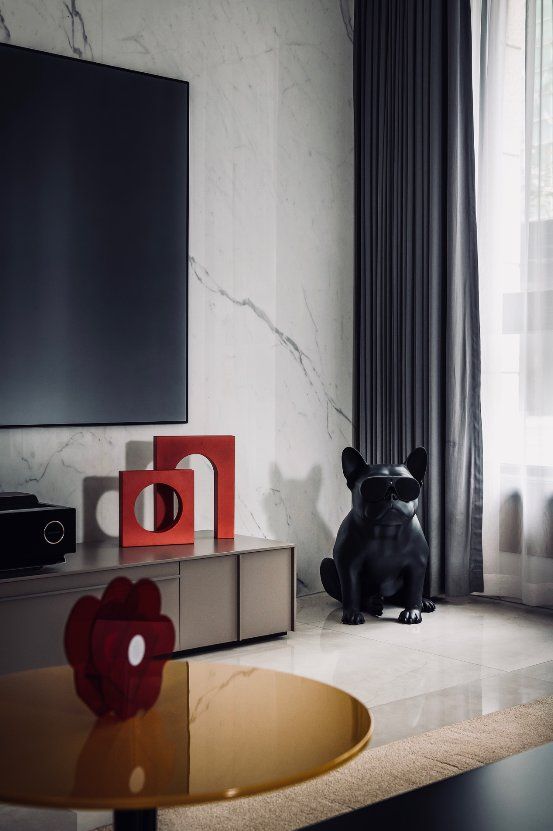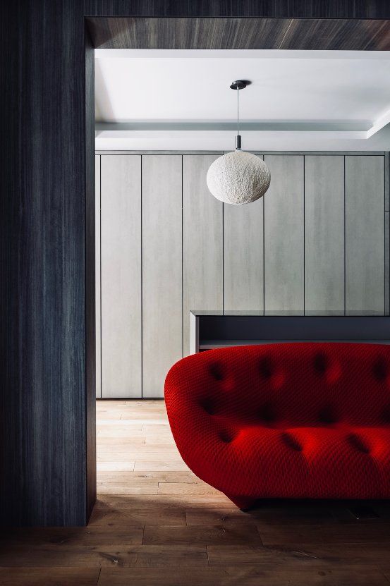 整个空间是寂静而温柔的,但暖色的落地灯与造型别致的红色沙发又默默焕发出独特的表现力和持久的生命力。