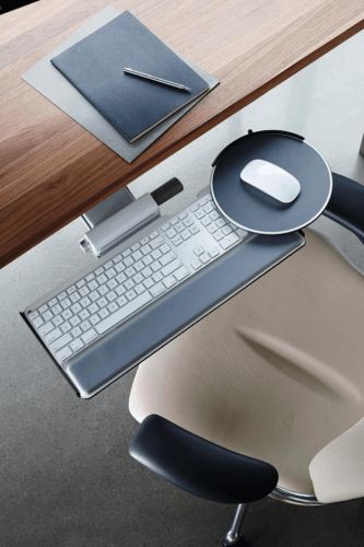 一个符合人体工程学的工作站关键要素之一就是设计精良的人体工程学键盘系统,Humanscale自1999年起就是人体工程学键盘系统的引领者。Humanscale Keyboard Systems键盘系统通过主动将键盘向前推送给办公族们,使其能正常倚靠在座椅靠背上而无需身体前倾,上半身及手腕都能得到自然放松并能以中正的坐姿办公,降低肌肉劳损。轻薄的设计让膝盖与键盘平台之间留有最大空隙,可以方便腿部自由活动。如有需要,他们可以通过轻松调节键盘架的倾斜度从而调整至合适的高度。Humanscale Keyboard Systems键盘系统性能卓越稳固且重量比其他类似产品轻25%,是职场人士健康办公的理想选择。