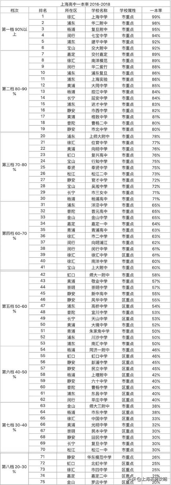 我们先来看一下2016年-2018年上海各大高中的一本率数据: