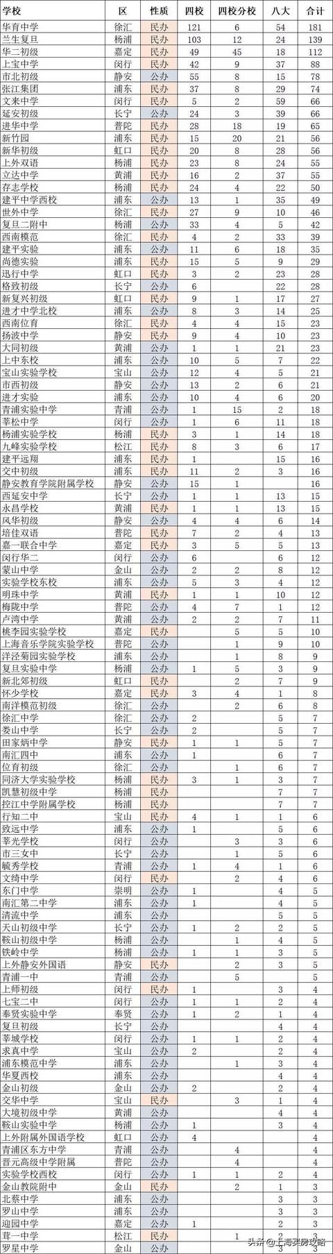 在上海,进入四校八大的人数也是衡量一个初中教育水平的标准。下表统计了2018年上海Top100各初中进入四校八大的人数。
