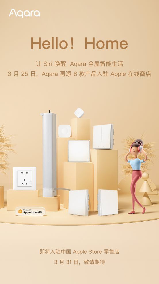 2020年3月25日,深圳——绿米联创旗下品牌Aqara 再添8款智能家居产品入驻Apple中国在线商店,包括 Aqara 无线迷你开关、Aqara 无线远程开关D1(单键)、Aqara 智能墙壁开关D1(单火线单键版)、Aqara 墙壁开关D1(零火线单键版)、Aqara墙壁开关D1(零火线双键版)、Aqara 动静贴、Aqara 窗帘控制器、Aqara墙壁插座,这些产品均可兼容Apple HomeKit。至此,Aqara 共有16款产品在 Apple 在线商店展示和销售,为爱好智能家居产品的Apple用户提供更丰富的Apple HomeKit 体验。