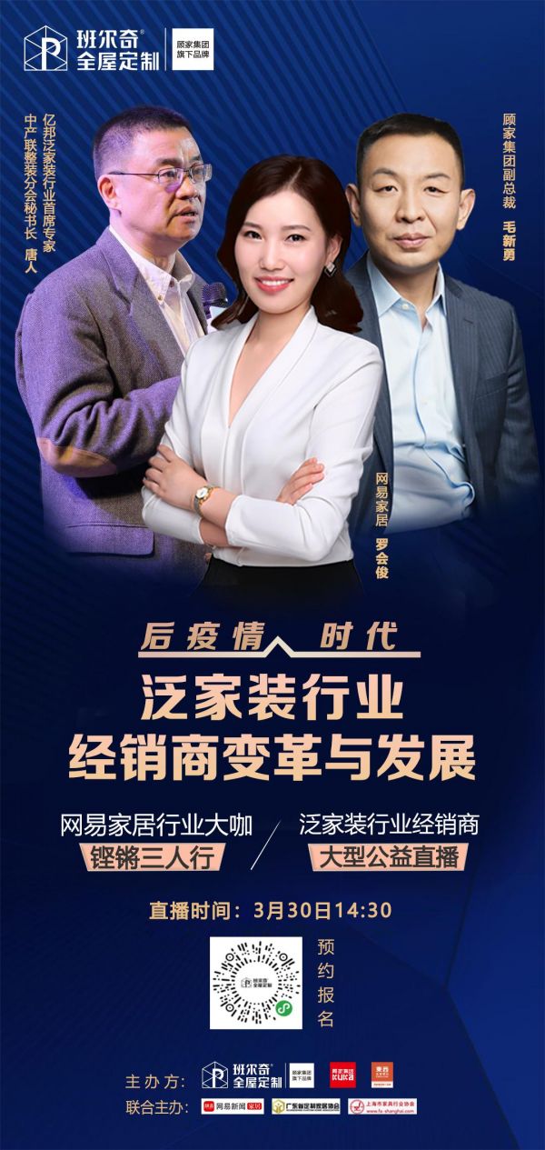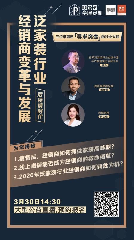 3月30日14:30,班尔奇全屋定制携手网易家居、中产联整装分会秘书长、亿邦泛家装行业首席专家 唐人,举办一场教会您“转危为机”的公益讲座,带您“寻求突破”,现场更有神秘嘉宾莅临,网易家居将进行全程直播,敬请期待。