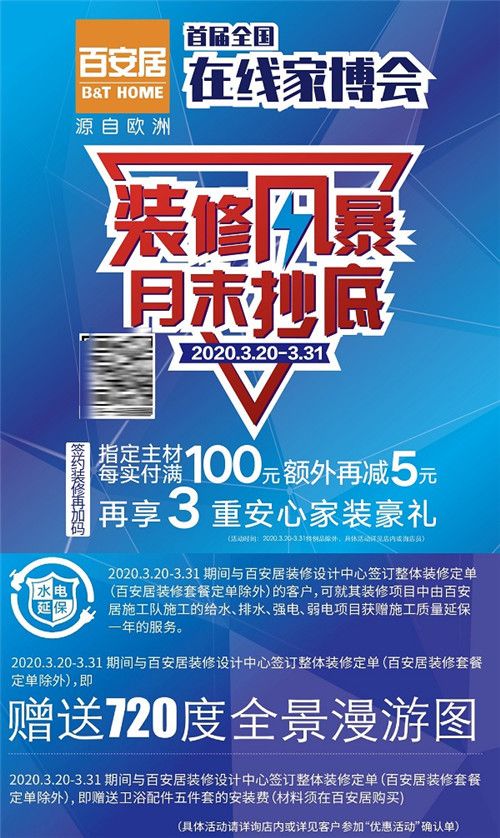 此次家博会,百安居联合近百家知名家装品牌用前所未有的优惠力度持续为家博会加码,不仅减少了中间环节,确保低价。也为消费者提供更优质的选择与服务。为了回馈广大消费者,百安居在家博会期间进行超级福利大放送,对于在线选购建材的家装消费者,能享受精选品类的产品每实付满3000元可立减高达500元的优惠福利。在此基础上,为了将福利最大化,百安居升级服务理念,加大优惠力度,叠加了每满2000元再送100元的全场礼金。双重优惠福利开启消费者家装狂欢。