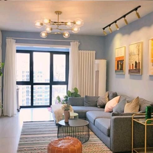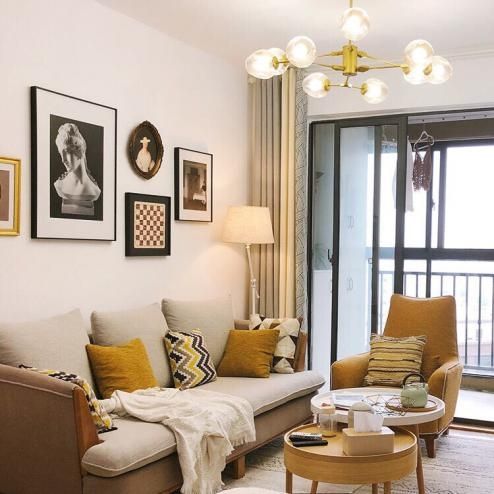客厅搭配北欧分子灯,H65黄铜灯体、透明玻璃灯罩、可调节灯杆,它是善变的空间魔术师,灯光如何延伸,听你的。