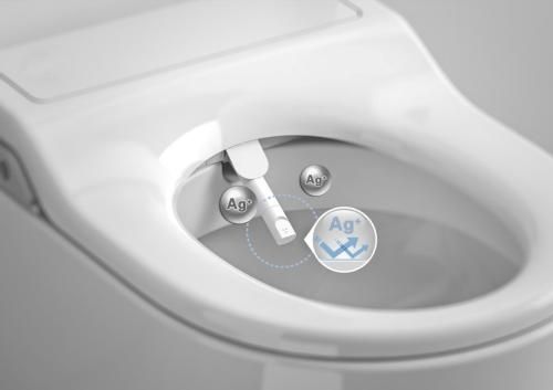 英佩拉 FS一体式智能座厕,配备 Ag+ 抗菌材质的座圈和喷嘴。银离子有超强的催化作用,催化出得力帮手原子氧,能有效隔离 99.9% 的细菌微生物,从而达到座圈长效抑菌的效果。