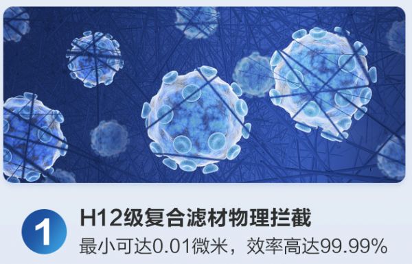 作为皓庭空气消毒机的净化第一步,高效复合过滤层采用静电驻极熔喷技术制成,可拦截气溶胶、PM2.5、尘螨、过敏源等直径低至0.01微米的细颗粒物,拦截率达到了99.99%,效率远超N95标准。同时它的展开面积高达6㎡,相当于一般淋浴房卫生间的面积,这个数据要远超某米的滤芯展开面积。