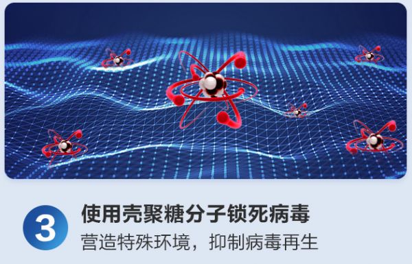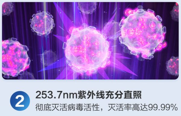 在对空气中的病毒进行有效拦截后,皓庭空气消毒机内置的253.7纳米UV灯将对病毒进行第二步净化,通过充分的辐照破坏附着在滤芯上的病毒RNA,彻底杀灭病毒活性,灭活率可达99.99%,而高效符合过滤层表面的壳聚糖分子则能有效锁死病毒,营造特殊抑菌环境,防止病毒再生,真正实现“三步还原纯净空气”。