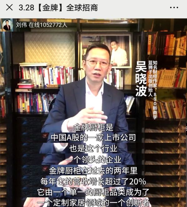 2020年3月28日晚,金牌厨柜全球VIP直播招商会盛大开幕,知名财经作家吴晓波、全国工商联家具装饰业商会执行会长张传喜、乐居家居总编辑、乐居财经家居总经理戴蓓、居然之家福建总经理时仲昶等大咖实力助阵!