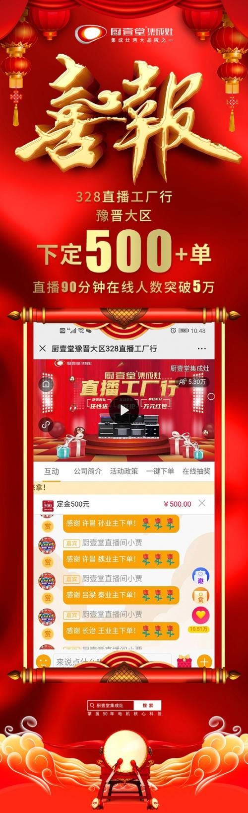 2020年的开局石破天惊,疫情和延迟复工引发的线下推广活动和相关的市场营销活动在近几个月内几乎全部暂停。厨壹堂积极创新模式,在3月14日举办了首届直播厂购会,成绩喜人。继第一届线上厂购会成功举办后,厨壹堂在3月28日19:00再次举办了豫晋大区直播厂购会。本次直播活动由销售部出谋划策,并联合其他部门坐镇直播阵地,为直播提供强有力的保障,在活动的筹备方面,更是上了一层楼。