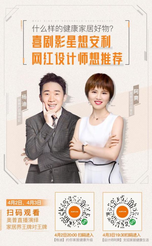 在4月2日、3日的晚上8点,奥普家居会在直播间展示家居好物,当然,产品行不行,奥普家居自己说了不算,得作为用户的杨迪和阿爽点赞才作数。