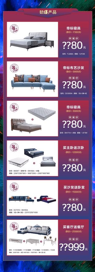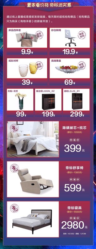 帝标家居将通过线上直播或是提前发放链接的形式,每天限时限量超低秒杀爆款产品。床品四件套9.9元,帝标砂白转椅19.9元,炫彩对杯39元,高端果盘69元,高端花瓶99元,餐边柜199元, 酒柜299元,价值399元的除螨被芯+枕芯,帝标舒享椅599元,帝标寝具2980元。秒杀爆品只为购买《购物手册》的顾客开放,数量有限,先到先得哦!
