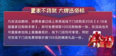 凡在活动期间,消费者通过线上系统或线下门店购买20元《4.18全国置家日 购物手册》,即可免费领取100元购物券一张,在活动当天可直接参加线上直播最低价,线下门店均可享受,同时可在线下门店免费领取价值159元的精美礼品一份。