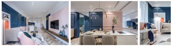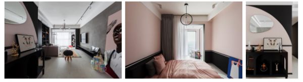 以浅粉色调作为整体空间的色彩亮点,设计师借用插画配色手法,大面积采用粉色和黑色这一组对比色点缀空间。双色对撞不仅凸显了空间的独特个性,还烘托出大气简约而不单调的居家氛围,有限的空间里流淌着业主对生活的无限热爱。