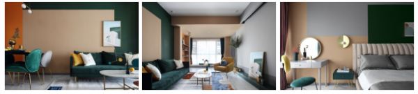 与2020多乐士全球色彩趋势中的"趣玩之家"色盘高度契合,设计师通过颇具创造力的色彩搭配打破空间边界,巧妙营造出色彩斑斓的盛夏季节感。以高雅的黑白灰作为底色,匠心点缀玛瑙绿、果肉粉、橘子黄、橙色等鲜活色彩,再与大理石、金属、玻璃、布艺等多样材质相搭配,如"橘子味的夏天"一般宁静欢愉的生活氛围扑面而来。