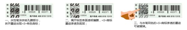 1. 通过防伪标签物理自检:步骤包括(1)水性笔涂抹核孔膜部分,抹开墨迹出现施耐德电气标识的有色商标;(2)揭开标签表面透明薄膜,可见施耐德电气标识的商标墨迹渗透到底层;(3)施耐德电气标识渗透的墨迹与水笔同色,可被擦掉。