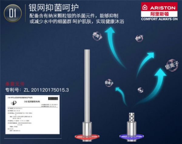 阿里斯顿电热水器Velis Plus SA采用专利AG+银网抑菌技术(专利号 ZL201120175015.3),通过在内胆放置含有纳米颗粒银的杀菌元件,能够抑制或减少水中的菌群。银离子的杀菌效果是一般杀菌剂的一百倍以上,并且杀菌范围非常广泛,可有效杀死超过650种病原菌,抑菌率高达99%。而且不会产生其他有害物质,更不会形成二次污染。从而彻底改变了热水器内部的“生态环境”。