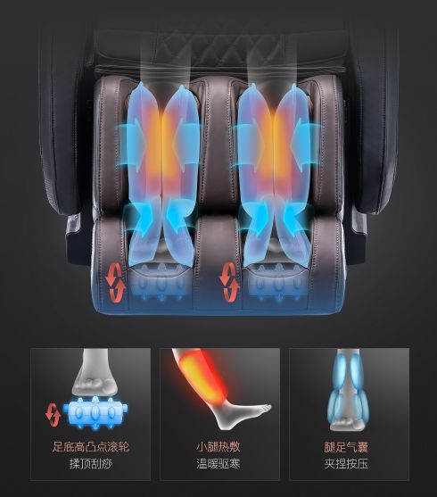 腿足:除了肩颈,腰臀,人们的腿足也是特别容易疲劳的,比如经常穿高跟鞋走路站立,或者跑步运功等都会对人体的腿足造成一定损害。奥佳华OG-7688按摩椅具有小腿热敷功能,放松小腿紧张的肌肉。足底高凸点滚轮,可以做到揉顶刮痧,有力刺激穴位,缓解足部一天行走的疲累。