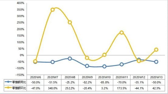 3月31日,中怡康发布第13周空调行业最新数据:行业继续下行,线下零售量同比增长-43.6%,零售额同比增长-50.0%,几近腰斩。各级市场数据也不乐观,一级市场线下零售额同比增长-58.4%,二级市场也达到-47.5%。
