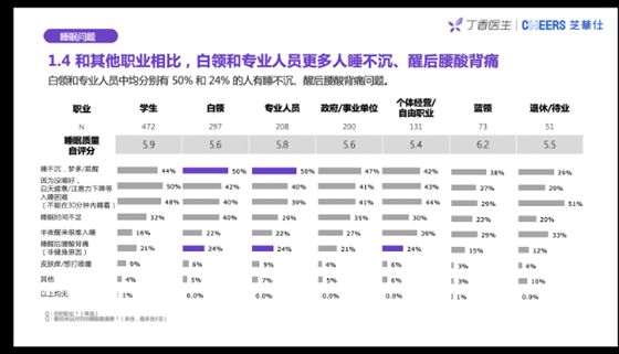 报告显示,50%的白领表示晚上经常睡不沉,梦多易醒;另外,24%的白领觉得睡醒后经常腰酸背痛,常常睡不好觉。而导致他们睡眠质量普遍差的诱因主要是由于生活节奏快,社会和工作上的压力,持续性的熬夜加班,再加上不规律的生活作息,使得他们成了失眠的高发人群。