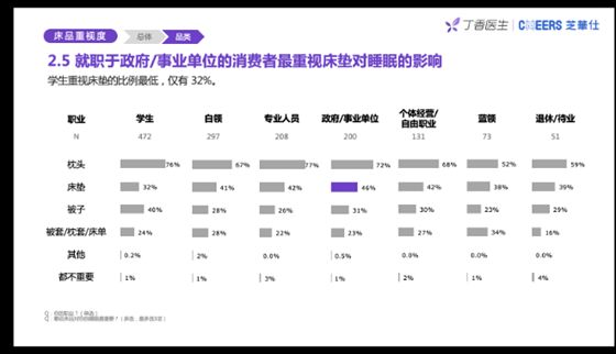 报告显示,47%的就职于政府/事业单位的消费者表示经常睡不沉;41%的公务员认为睡不好的原因在于入睡困难,睡眠不足导致白天疲惫,注意力下降等。究其原因,除了工作上的压力外,床垫也是一个至为关键的问题。