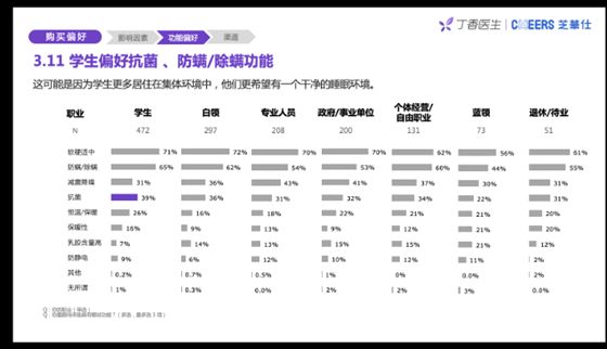 报告中显示,学生群体突出的睡眠问题是入睡困难和因为没睡好导致的白天疲惫/注意力下降等;另外在调查中,48%的人表示入睡困难,不能在30分钟内睡着;32%的人睡眠不足;还有44%的人睡不沉,梦多易醒。此外,值得我们注意的是,9%的学生认为睡在集体环境中,皮肤容易瘙痒,老是想打喷嚏是睡不好的“罪魁祸首”,因此39%的学生更希望拥有抗菌的睡眠环境。