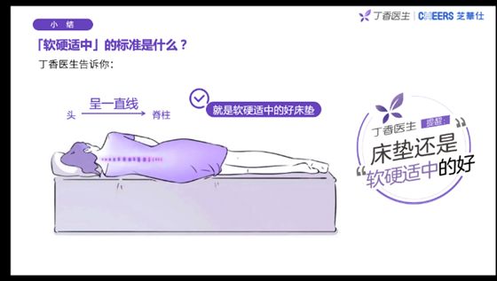 对于床垫的选购,丁香医生支招:“床垫还是软硬适中的好。”床垫要能够轻松地接受人的体型,承托人的体重,无论是在侧睡或平躺的时候,脊柱都可以保持在自然的曲度上,保证睡觉时,脊柱处于舒适的状态,这样才能缓解疲劳,从而带来健康的睡眠姿势。