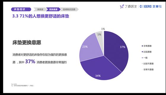 在这些不满意的被访者中,71%的人表示愿意更换更舒适的床垫,其中37%的人更换意愿非常强烈。另外,对目前使用床垫非常满意的消费者中,仍有55%的人愿意更换更舒适的床垫。由此可见,床垫影响睡眠质量,国人对于床垫的购买认知也在改变。