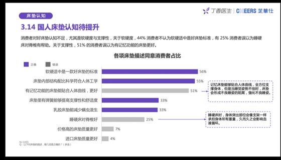 关于选购床垫的认知中,60%的人表示会更加注重床垫软硬度,而54%的人则注重价格,其实床垫好不好,身体感受说了算。如果想选择有助于睡眠的床垫,能够拥有那么软硬适中的床垫则是很好的选择。但被访者中可近一小半人,忽略了这一守护健康的核心功能。其中44%的消费者不认为软硬适中是好床垫的标准,有25%消费者误认为睡硬床对脊椎有帮助,甚至有51%的消费者认为有记忆功能的床垫更好。