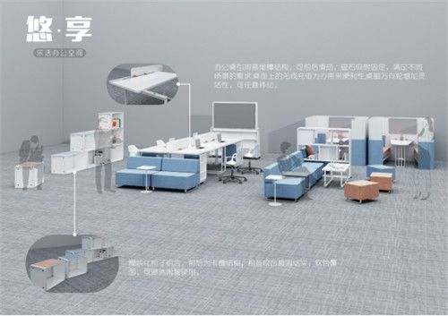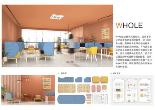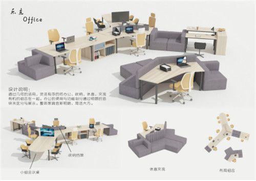 本作品以简洁的造型、典雅的用色和变通的结构为办公空间提供一个灵活多变的解决方案以适应不同的场景需求,营造出悠然共享的办公氛围。再加上燕尾榫、磁铁和平板的使用,使得整个产品便于拆装收纳和移动运输提高整体效率。不失为较理想的设计方案。