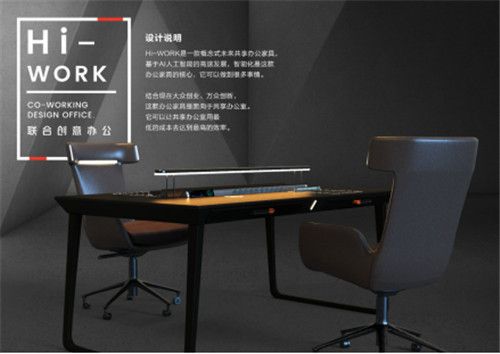 整体设计风格新颖,简洁明快。设计中运用六边形的几何元素,有利于满足现代办公环境办公、会议、洽谈、休闲等多种功能组合与变换;同时,该设计采用了桌面自动升降、智能充电等装置与技术,满足了办公环境健康、舒适、高效的需求。