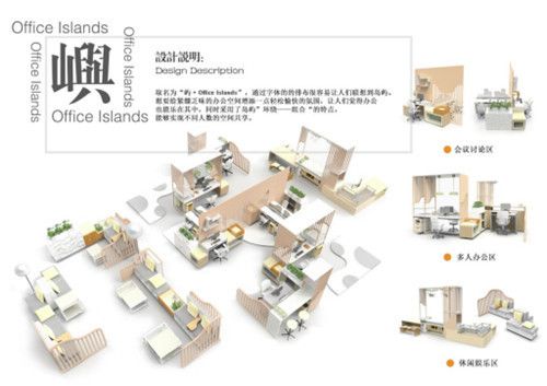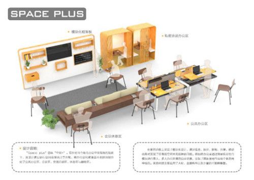 本作品采用模块化设计的理念,借助于组合、拆分、解构、升降和移动等手段,使得产品能够满足各种办公功能空间和办公人员的各种需求。同时通过材料、色彩的运用将各功能空间的极易识别;且各办公单元间关联性较强,一体性较好。