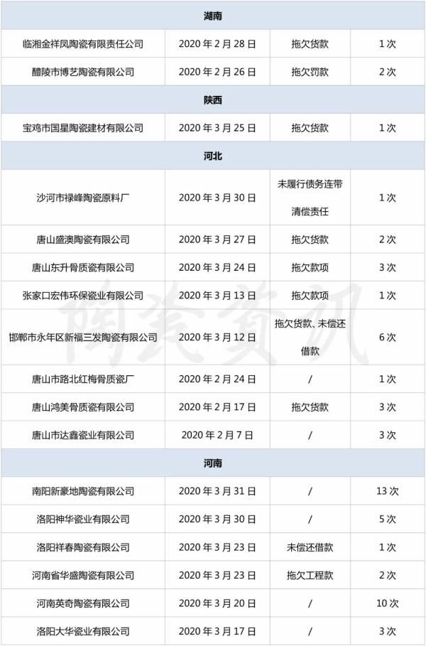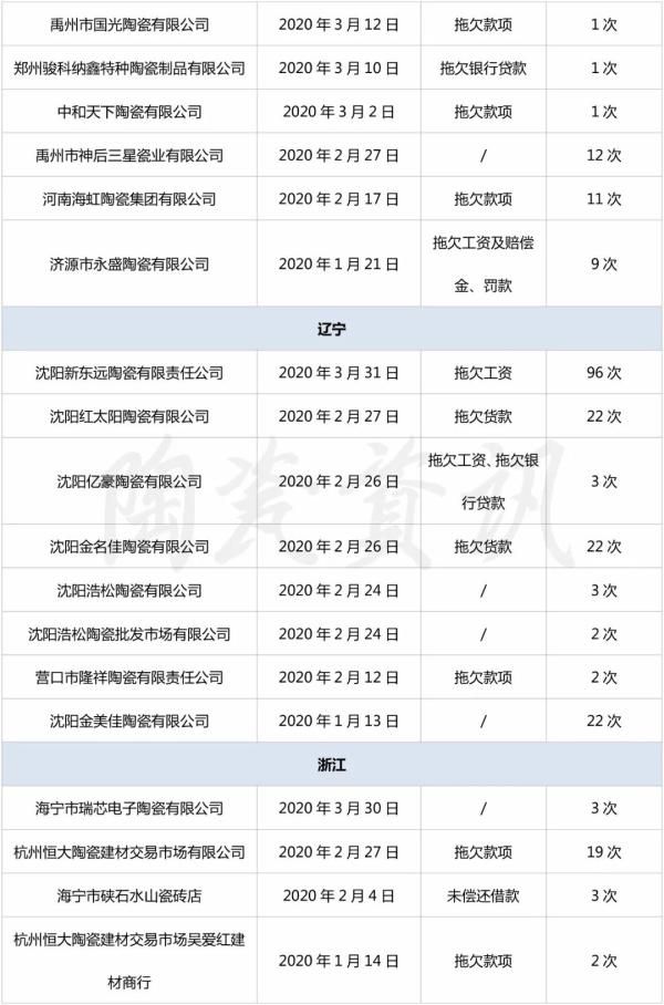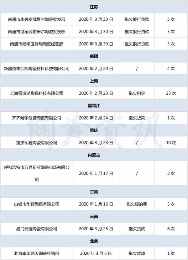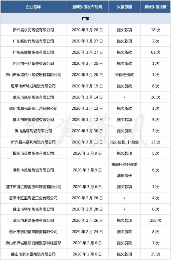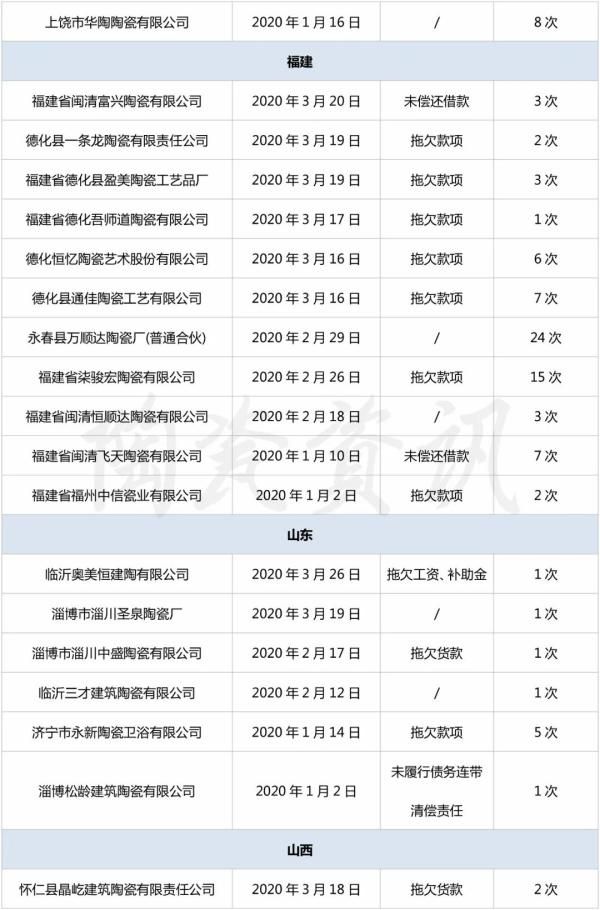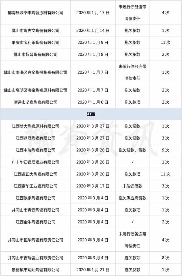根据最高人民法院及各地法院发布的失信被执行人信息统计:2020年1-3月,全国各地有120家陶瓷企业被列入“失信被执行人”名单,名单涉及23个省(市)。此次名单中,广东省的失信陶企最多,有27家,其次是江西、河南、福建,分别有13、12、11家。其中,有家陶企的失信累计次数高达258次。据统计,这些“失信被执行人”的上榜原因多为债务纠纷,欠款不还。此次名单中,最高拖欠供应商货款为600万元。(来源:陶业要闻摘要)