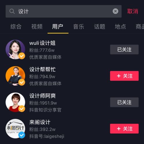 用抖音搜索家装设计相关关键词,排在最前面的账号都属于“尚品宅配”旗下账号