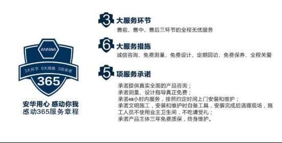 为了满足遍布全国的销售网络,公司建有专业、完善的售后服务网络;其一直追求“始于品质,终于服务”,ANNWA安华自品牌创立之初就提出“感动365服务”体系,走近用户,零距离倾听用户的意见和建议,并持之以恒,不断提升用户的满意度。